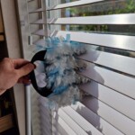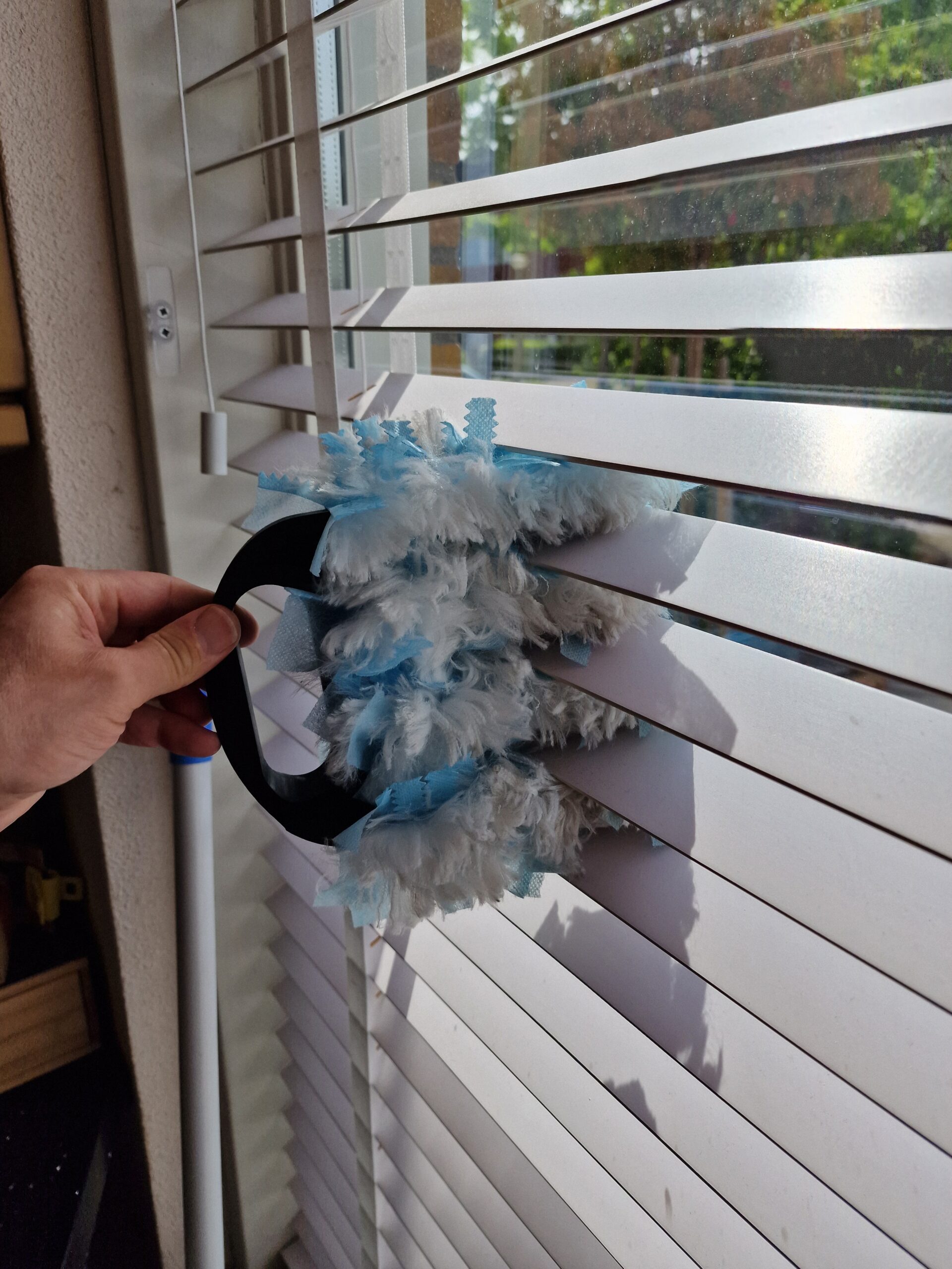 Je draait de lamellen horizontaal, steekt de armen van de borstel tussen de lamellen en in een vloeiende drukkende beweging zijn 5 lamellen (tussen de banden) schoon.