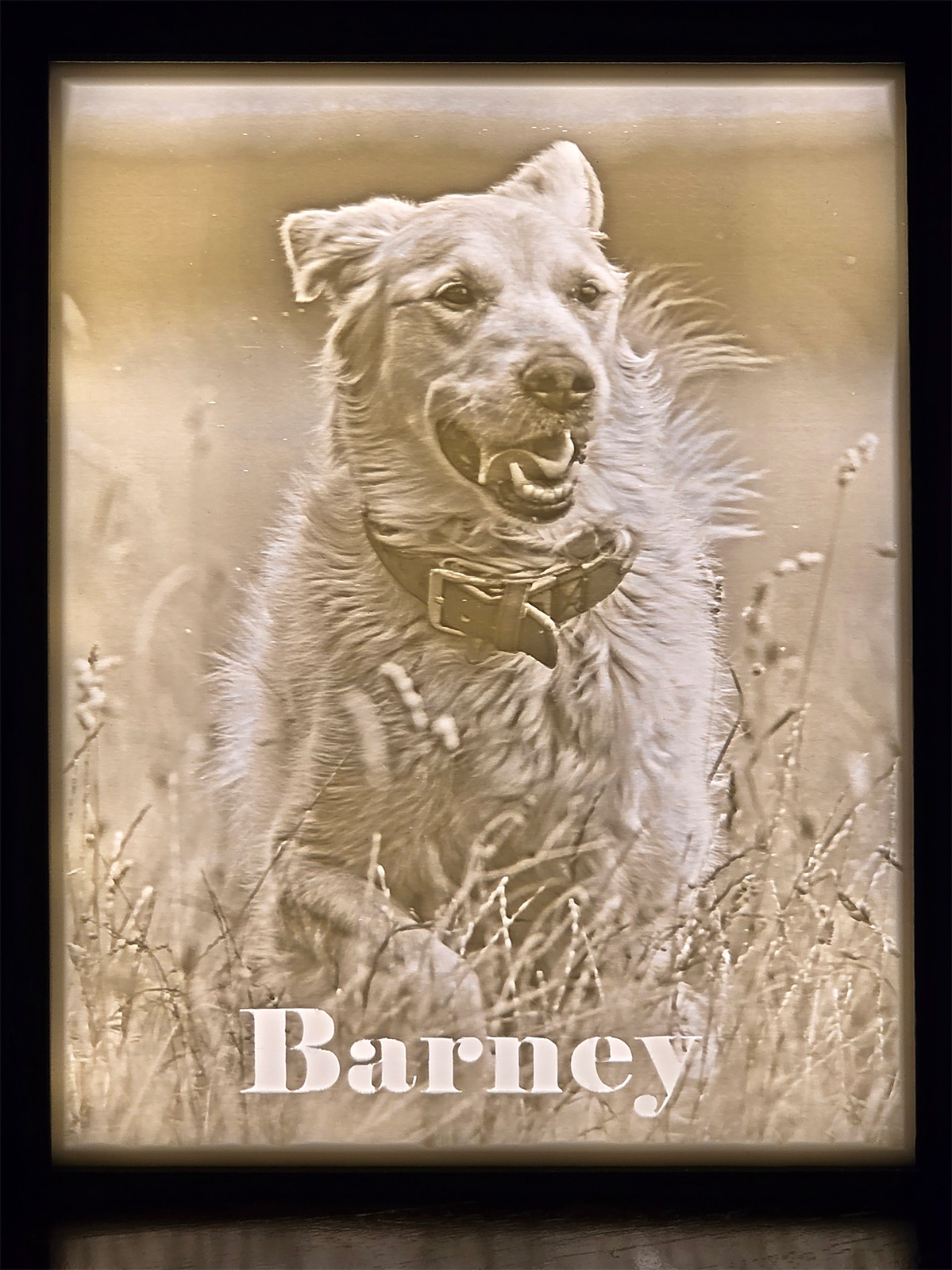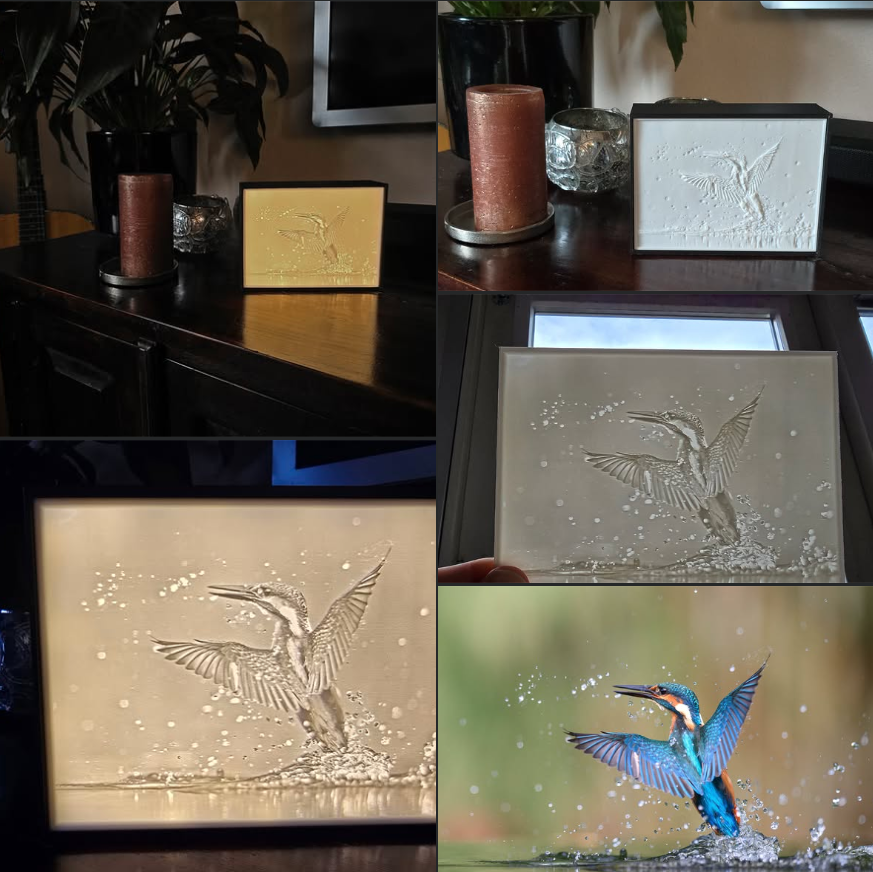 Ook is het mogelijk om een Lithophane lightbox te produceren aan de hand van een foto. Zie voorbeeld hond en ijsvogel-collage.